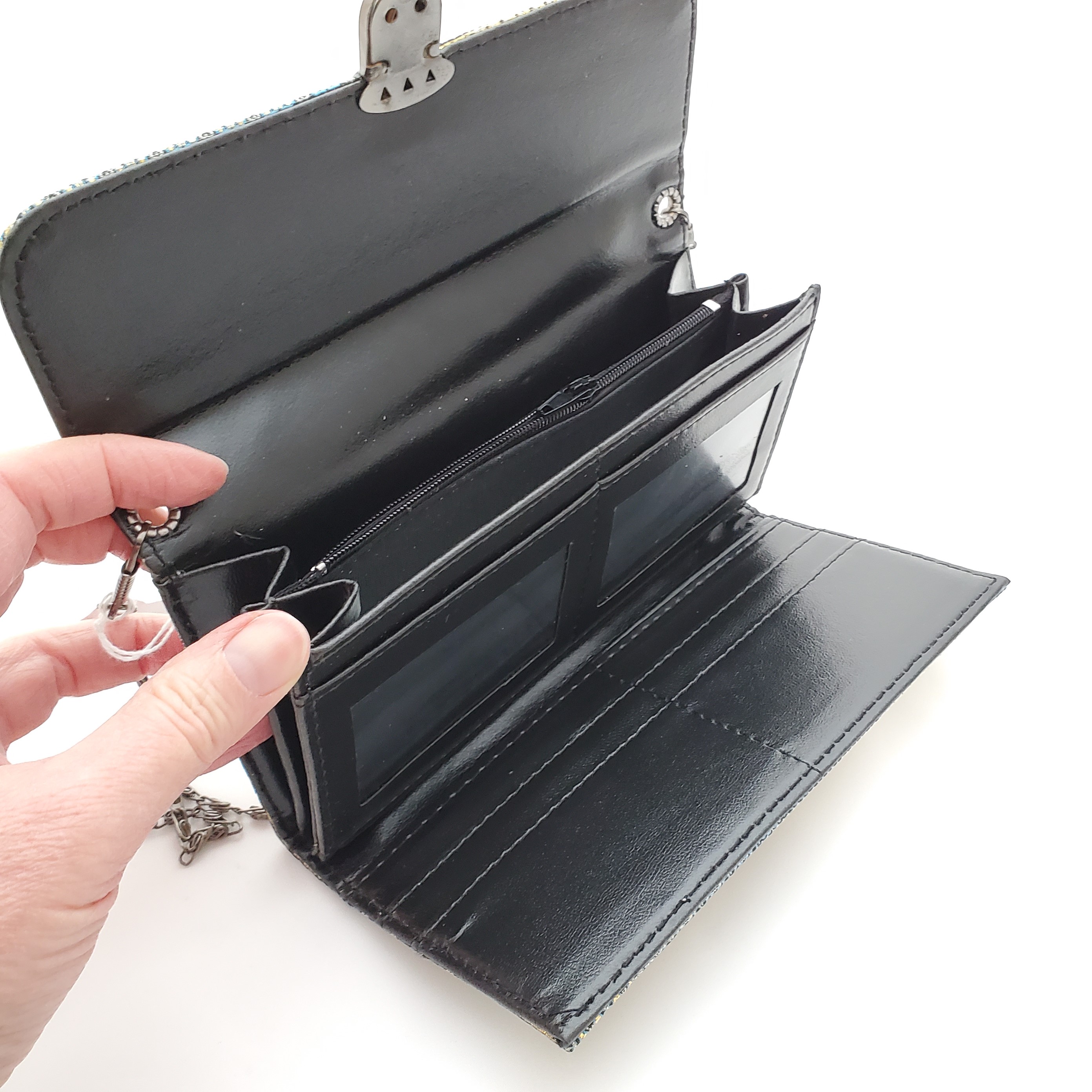 • Wallet measures 7-1/4" long x 3-1/2" tall with overall height 26" including brass chain strap